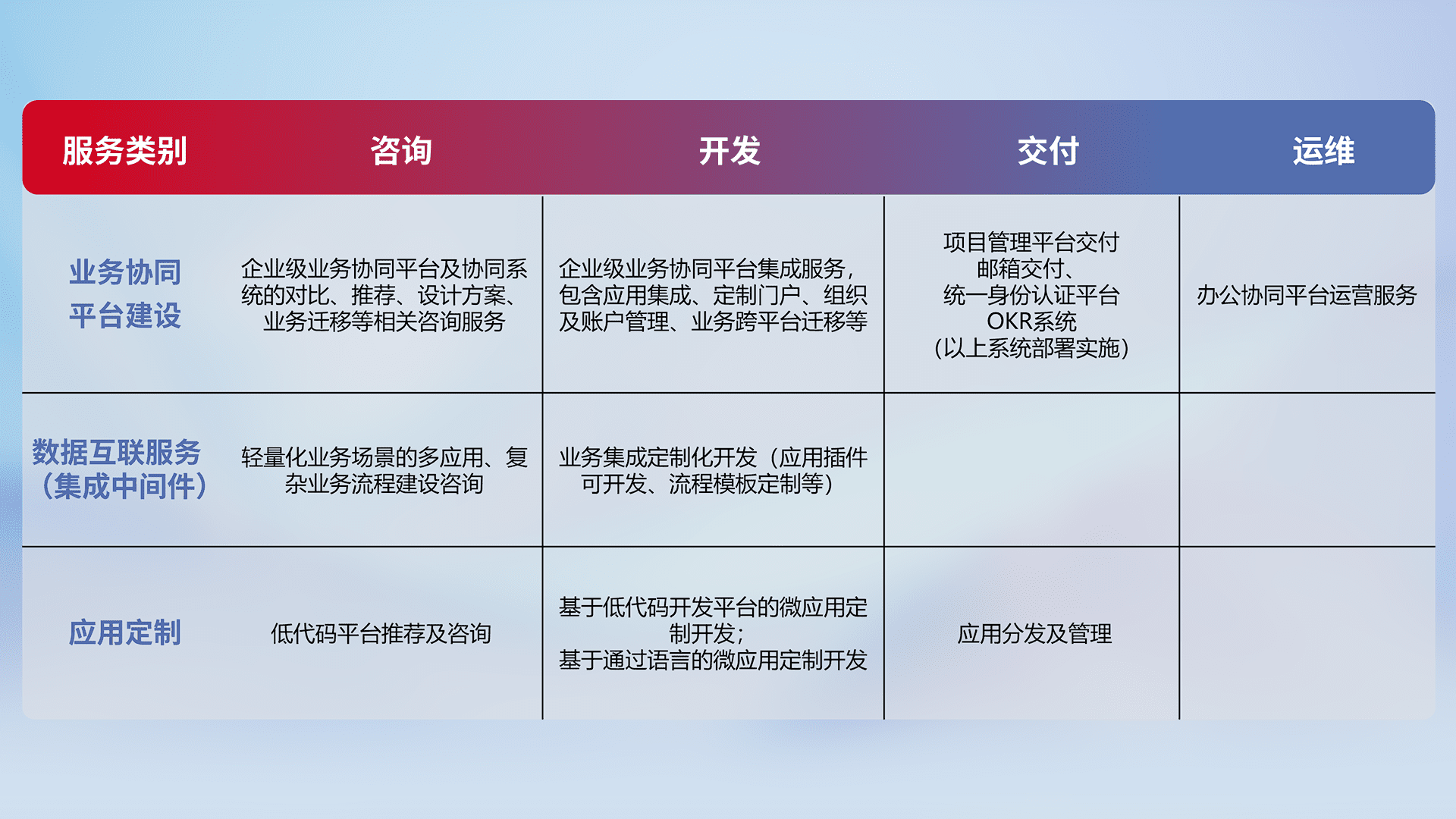 针对钉钉、、企微、、、IDaas等平台级产品提供产品的规划、、、、方案、、交付、、、定制化开发等服务,,实现如统一协同办公、、智能客户服务、、、、混合会议管理、、、、智能数据查询、、、、等业务场景,,实现数字化转型。。