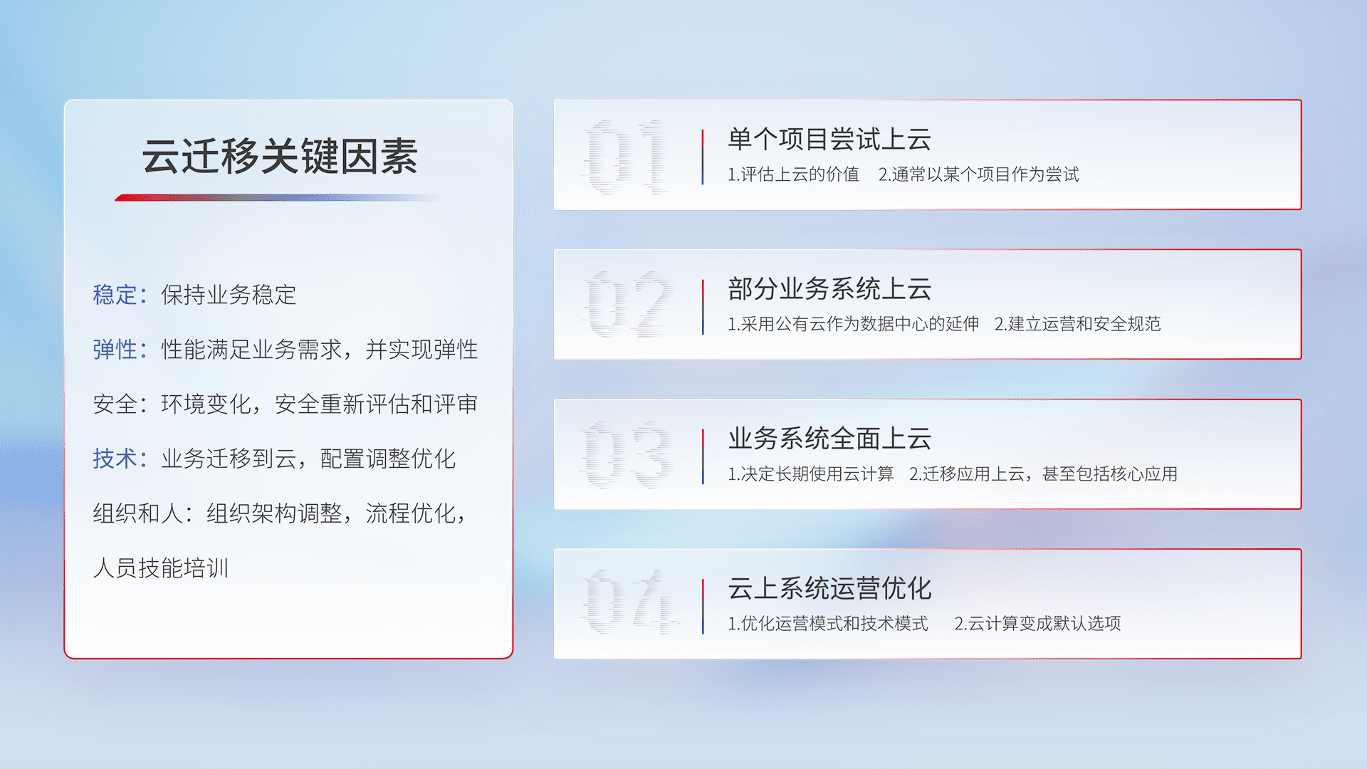 结合实际业务,,,从规划设计、、、云平台选型、、、、云原生改造、、、、数据迁移、、集成交付,,迁移全过程为客户识别最佳上云路径,,,,做好风险识别管理,,,设计网络架构、、身份权限、、、、安全审计合规、、、操作审计、、日志审计、、监控告警策略、、多站点容灾设计等,,,对云上基础设施进行整体规划,,,提升IT治理水平,,,以满足弹性、、、高可用、、高性能的需求。。。