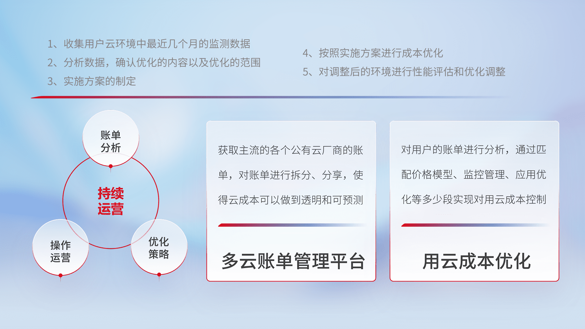 通过多云纳管,,,,以统一的资源数据模型把客户的云资源进行抽象和封装,,进而实现对多云资源的统一操作,,保障云资源管理的可靠性、、、稳定性与可用性。。。。量身定制化运维内容,,配置、、开发运维、、补丁管理、、、、备份、、、、监控、、、认证和访问管理、、、、审计和日常巡检等,,保障在用云过程中的可靠度,,稳定度以及高可用率。。