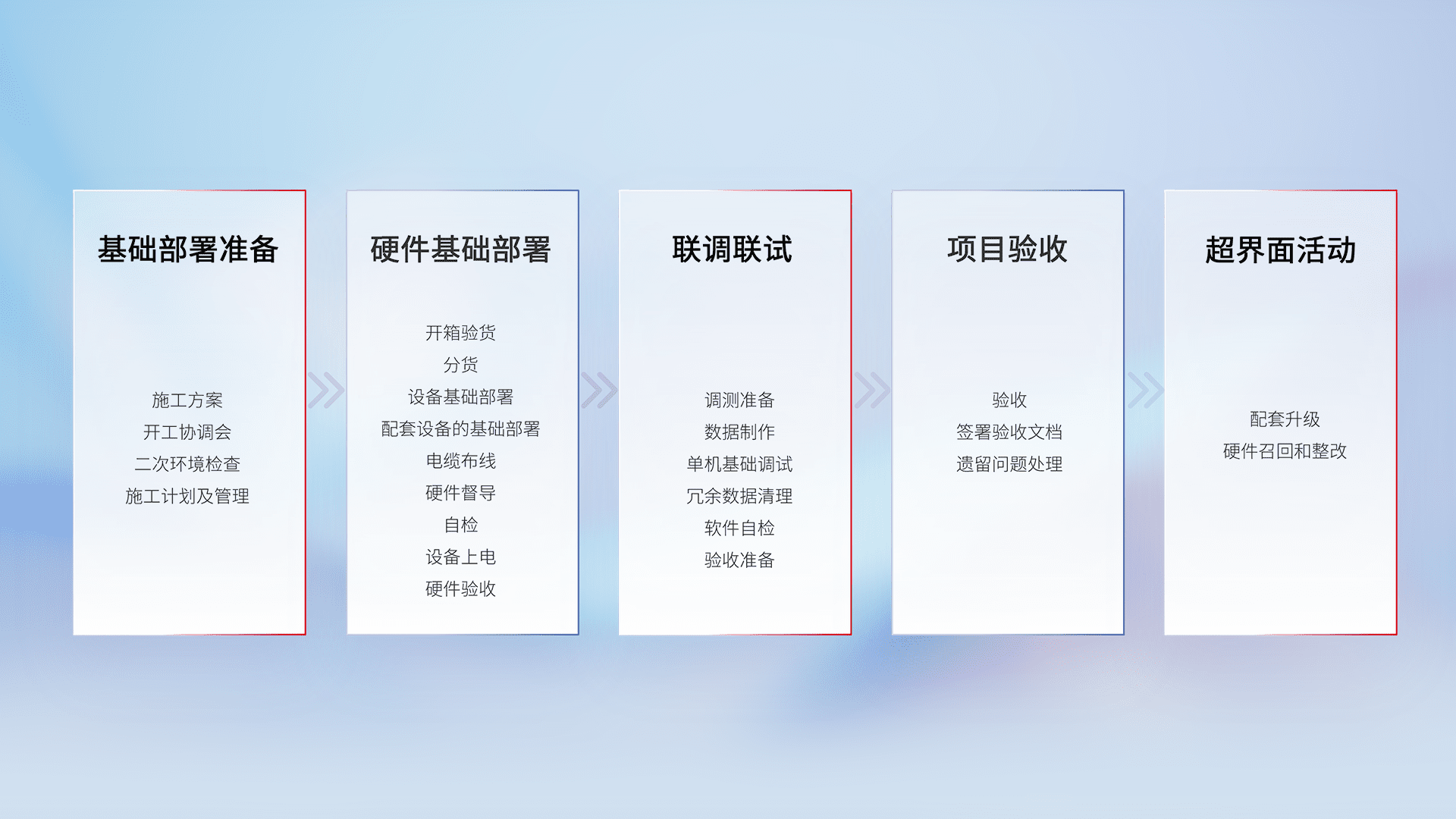 从基础部署准备、、、、硬件基础部署、、、、联调联试、、、、项目验收、、越界面活动的全过程可追溯,,,,保证施工质量和进度。。。。